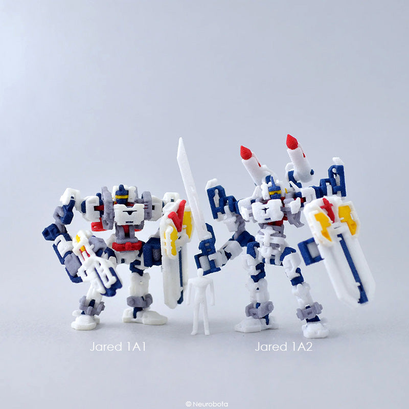 The model kit (Jared 1A2) comprises of 65 parts and upon assembly, it reaches a height of approximately 34mm. With 36 points of articulation, it allows for intricate and lifelike posing. Additionally, the hand-held weapons are interchangeable among various Jared variations.